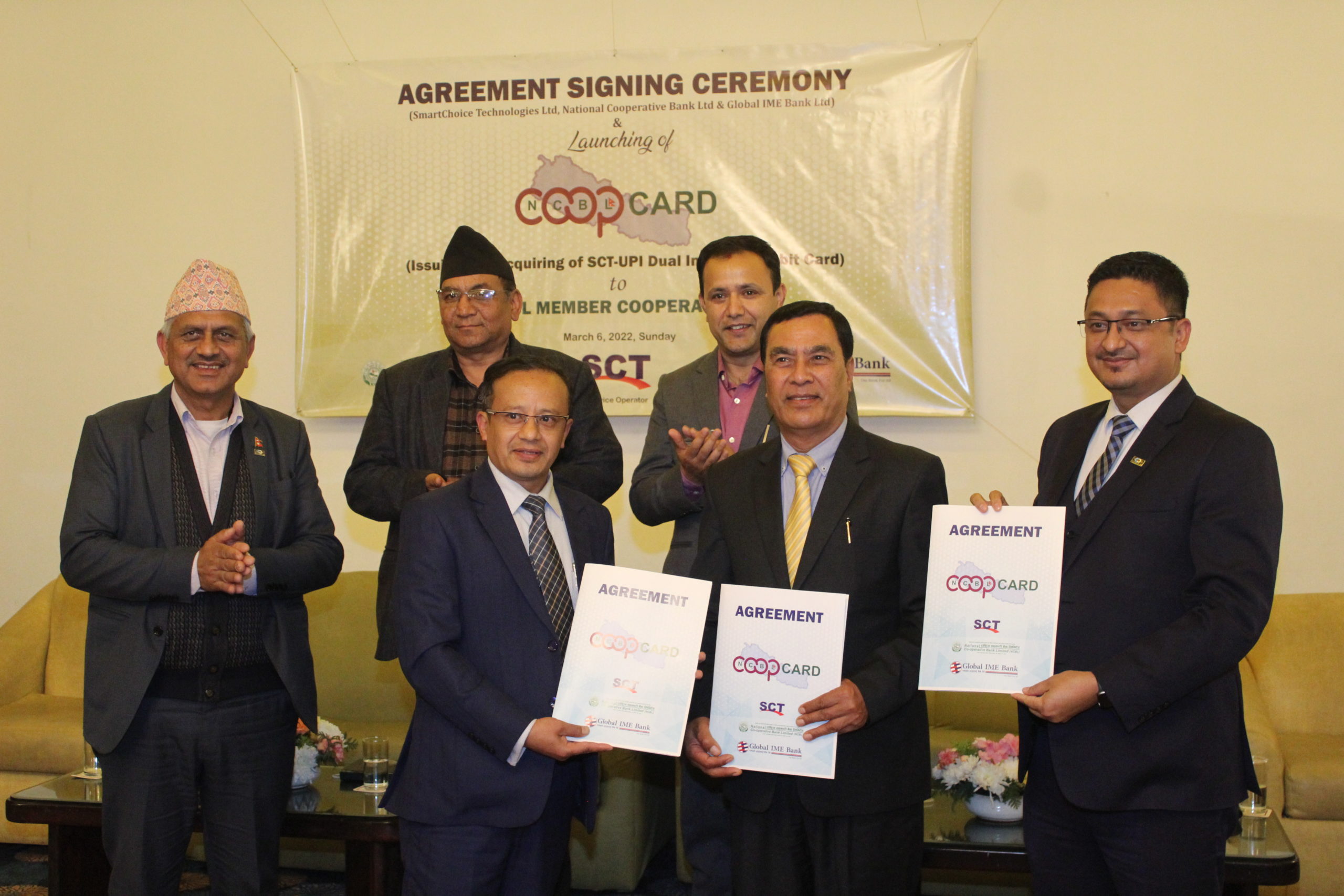 ललितपुर । सहकारी संघ/संस्थाहरुको लागीआफ्नै ब्राण्डको कोप (एटिएम)कार्ड जारी गर्ने उद्देश्यका साथराष्ट्रिय सहकारी बैंक लिमिटेड सहितस्मार्टच्वाइस टेक्नोलोजिज लिमिटेड (एससिटी) र ग्लोबल आइएमई बैंक लिमिटेडएटिएम कार्ड सेवाप्रदान गर्ने सम्बन्धी सम्झौंता भएको छ । आईतबार हिमालय होटल ललितपुरमा एक कार्यक्रमको आयोजना गरी सम्झौतामा राष्ट्रिय सहकारी बैंक लिमिटेडको तर्फबाट प्रमुखकार्यकारी अधिकृत बद्रीकुमार गुरागाई, एससिटीको तर्फबाट प्रमुखकार्यकारी अधिकृत नारायण प्रकाश भुजु र ग्लोबल आइएमई बैंक लिमिटेडको तर्फबाट प्रमुखकार्यकारी अधिकृत रत्नराज बज्राचार्यले सम्झौतापत्रमा संयुक्त हस्ताक्षर गरेका छन् ।