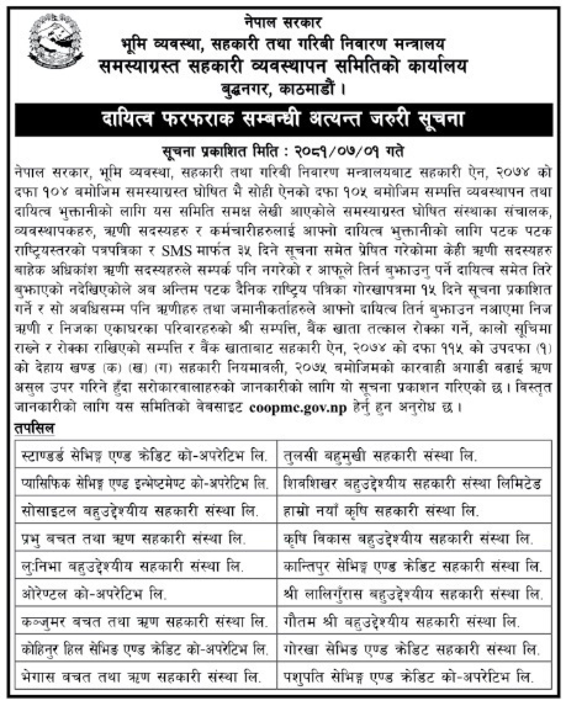 काठमाडौं । समस्याग्रस्त सहकारी व्यवस्थापन समितिले समस्याग्रस्त सहकारी संस्थाको दायित्व फरफारक गर्न अन्तिम पटक १५ दिने समयसीमा दिएको छ । समितिले बिहीबार एक सूचना जारी गर्दै सम्रस्याग्रस्त सहकारीका सञ्चालक, व्यवस्थापक, ऋण सदस्य र कर्मचारीलाई दायित्व फरफारक गर्न भनेको हो ।