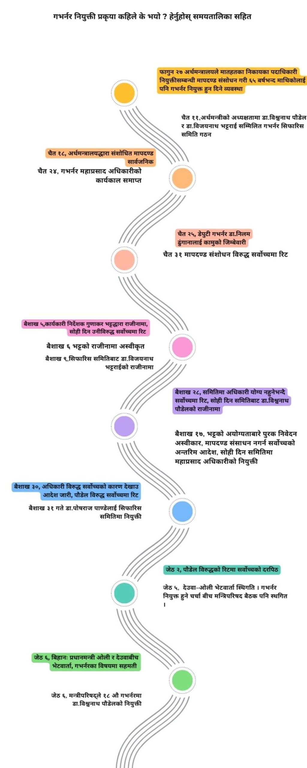 सरकारका प्रवक्ता पृथ्वी सुब्बा गुरुङले अर्थमन्त्री विष्णु प्रसाद पौडेल संयोजकत्वको समितिले डा विश्वनाथ पौडेल, कामु गभर्नर निलम ढुंगाना तिम्सिना र पूर्व सचिव दिनेश भट्टराईको नाम सिफारिस गरेको मध्ये डा पौडेललाई गभर्नर नियुक्त गर्ने निर्णय गरेको जानकारी दिए ।