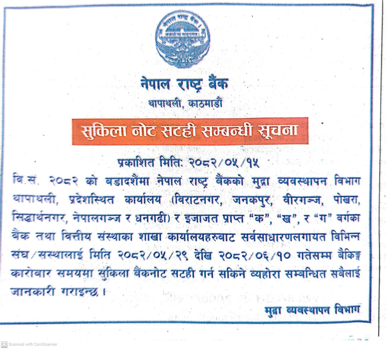 राष्ट्र बैंकले आईतबार सूचना जारी गर्दै दशैंका लागि राष्ट्र बैंकको मुद्रा व्यवस्थापन विभाग थापाथली, विराटनगर, जनकपुर, वीरगञ्ज, पोखरा, सिद्धार्थनगर, नेपालगञ्ज र धनगढीस्थित प्रादेशिक कार्यालयमा सुकिला नोट सटही सुविधा उपलब्ध हुने जानकारी दिएको छ । राष्ट्र बैंक बाहेकका बैंक तथा वित्तीय संस्थाका शाखा कार्यालयहरूमा पनि सर्वसाधारण तथा वित्तीय संघसंस्थाले नोट सटही सुविधा पाउने व्यवस्था मिलाइएको सूचनामा उल्लेख छ ।
