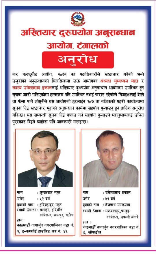 काठमाडौं । पूर्वअर्थमन्त्री एवम् नेपाली काँग्रेसको नेता डा.रामशरण महतले कर फस्र्यौटको विवाद तत्काल समाधान गर्नुपर्ने बताएका छन् । आर्थिक पत्रकार...