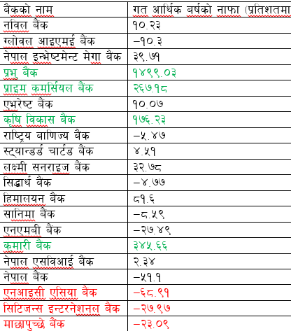 प्रकाशित विवरण अनुसार गत आर्थिक बर्षमा ९ वटा बैंक (ग्लोवल आइएमई, राष्ट्रिय बाणिज्य, सिद्धार्थ, सानिमा, एनएमबी, नेपाल बैंक, एनआइसी एसिया, सिटिजन्स इन्टरनेसनल र माछापुच्छ्रे बैंक) को नाफामा गिरावट आएको छ। तर, ती बाहेकका बैंकहरुले भने बढाएका छन् ।
