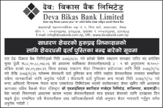 काठमाडौं । देवः विकास बैंकको सेयरधनी दर्ता पुस्तिका बन्द (बुक क्लोज) पुस १८ गतेबाट हुने भएको छ । कम्पनीको साधारणसभाले पारित गरेको २ बराबर १ को अनुपातमा हकप्रद सेयर जारी गर्नका लागि बुक क्लोज गर्न लागेको हो ।