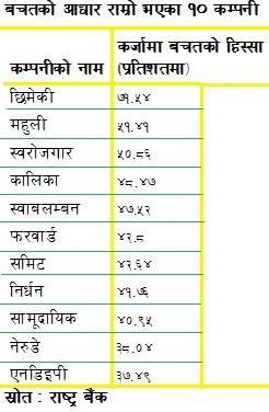 गत आर्थिक वर्षसम्ममा लघुवित्तहरुको कर्जा लगानीमा बचतको हिस्सा ३१ प्रतिशत मात्र छ । उक्त अवधिसम्ममा २४ अर्व ११ करोड रुपैयाँ मात्र बचत संकलन गरेका लघुवित्तहरुले ७७ अर्व २२ करोड कर्जा लगानी गरेका छन् ।