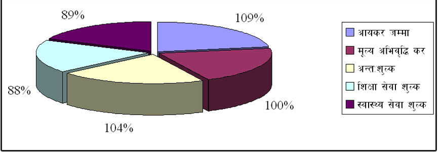 आन्तरिक राजस्व विभागका अनुसार आयकर तर्फ ६१ अर्व ८८ करोड ६० लाख, मूल्य अभिवृद्धि करतर्फ २८ अर्व ६० करोड रुपैयाँ र अन्तःशुल्क तर्फ २१ अर्व ८ करोड ४३ लाख रुपैयाँ संकलन गरेको छ । त्यसैगरी शिक्षा सेवा शुल्क र स्वास्थ्य सेवा करतर्फ क्रमशः ३८ करोड ४९ लाख र ५२ करोड ८५ लाख रुपैयाा राजस्व संकलन गरेको छ ।