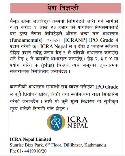 इक्रा नेपाल लिमिटेडले औसत भन्दा तल आधारहरु जनाउने आइपीओ ग्रेड ४ प्रदान गरेको छ ।