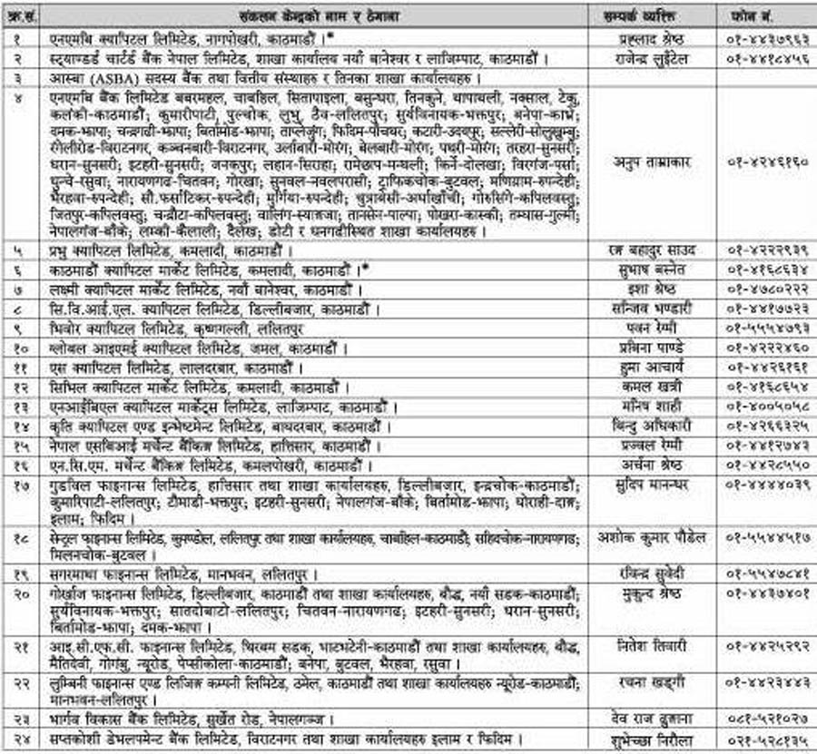 विहिबार आवहानपत्र सार्वजनिक गर्दै आस्वाको अनुमति पाएका नेपालका ४१ बैंक तथा बित्तीय संस्था र तिनका देशभरका ७३ जिल्लामा फैलिएका १ हजार ९ सय ७१ वटा शाखाबाट एफपीओमा दरखास्त दिन सकिने जानकारी दिइएको छ । यसैगरी बिक्री प्रबन्धक एनएमबी क्यापिटलको मुख्य कार्यालय र एनएमबी बैंकका देशभरका शाखा र अन्य तोकिएका केन्द्रहरुबाट लाइन लागेरै दरखास्त दिन सकिने बताइएको छ ।