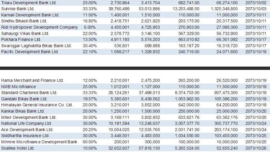 त्यसैगरी मितेरी डेभलपमेन्ट बैंकले ३० नेसनल लाइफ कम्पनीले ३० , सिद्धार्थ इन्सुरेन्सले ३०, साहारा विकास बैंकले ३५, मुक्तिनाथ विकास बैंकले ३४, छिमेकी लघुवित्त विकास बैंकले ४०, सिर्जना फाइनान्सले ५०, हाम्रो विकास बैंकले २५, कन्चन डेभलपमेन्ट बैंकले २५ र एनएलजी इन्सुरेन्स २५ प्रतिशत बोनस सेयर दिने प्रस्ताव गरेका छन् ।