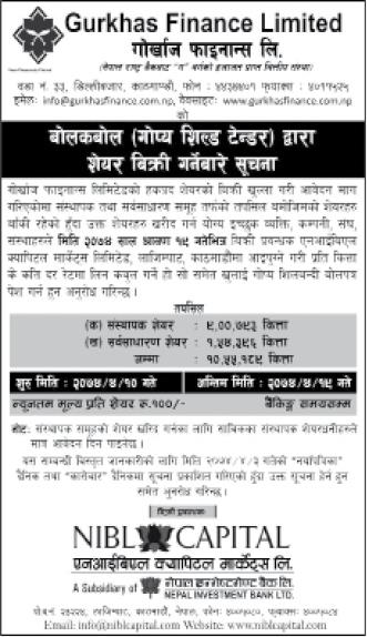 काठमाडौं । गोर्खाज फाइनान्सले साढे १० लाख कित्ता सेयर लिलामी गर्ने भएको छ । फाइनान्सले हालै जारी गरेको हकप्रद निश्कासनमा बिक्री नभएको सेयर लिलामीमा राखेको हो ।