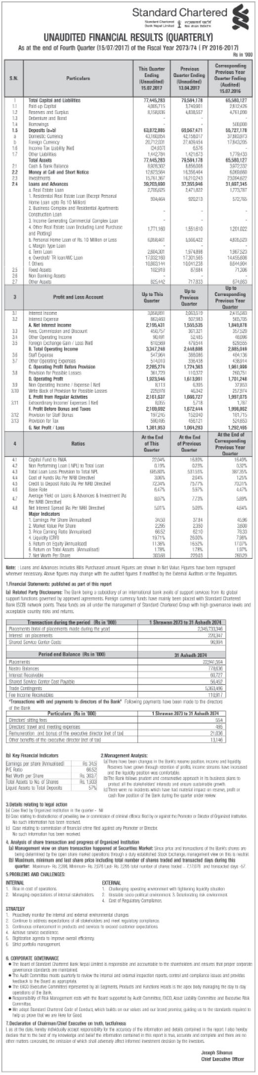काठमाडौं । स्टाण्डर्ड चार्टर्ड बैंकको गत बर्षको प्रगति सुस्त देखिएको छ । गत आर्थिक बर्षमा बैंकले १ अर्ब ३८ करोड १९ लाख रुपैयाँ खुद नाफा कमाएको छ । बैंकको नाफा अघिल्लो आर्थिक वर्षको भन्दा तुलनामा ८ करोड ९४ लाख रुपैयाँले मात्र बढी हो ।