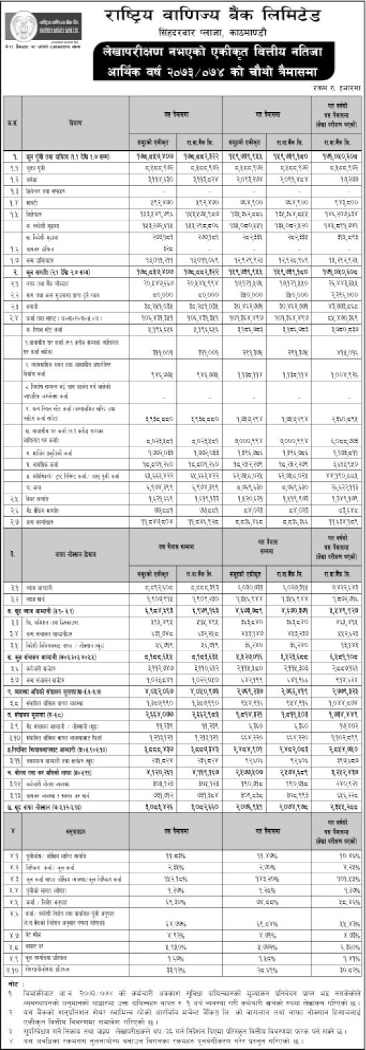 काठमाडौं । गत आर्थिक वर्षमा राष्ट्रिय बाणिज्य बैंकको नाफा ३० प्रतिशतले बृद्धि भएको छ । अघिल्लो आवमा २ अर्व ३५ करोड नाफा गरेको बैंकले गत आमा ३ अर्व ८ करोड नाफा गरेको हो ।