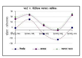 आर्थिक बर्ष ०७३/७४ मा नेपालबाट ७३ अर्ब रुपैयाँ बराबरको सामान विदेश निकासा हुँदा देशमा ९ खर्ब ९० अर्ब रुपैयाँ बराबरको सामान भित्रिएको केन्द्रिय बैंकको तथ्यांकले जनाएको छ । गत आर्थिक बर्षको व्यापार घाटा गत बर्षको बजेटको आकार एक खर्ब रुपैयाँले बढी हो । गत बर्षको लागि सरकारले ८ खर्ब १९ अर्ब ४६ करोड ८८ लाख ६४ हजाररुपैयाँको बजेट सार्वजनिक गरेको थियो ।