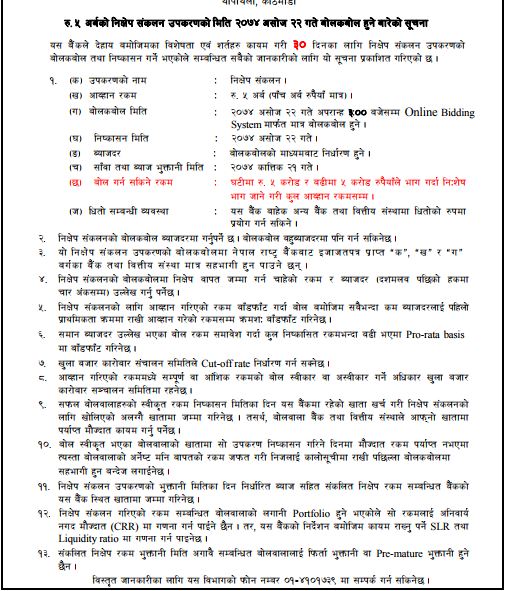 ३० दिन अवधिको उक्त निक्षेपको सावा र व्याज भुक्तानी कात्तिक २१ गते हुनेछ । यसको व्याजदर भने बोलकबोलबाट तय हुनेछ ।