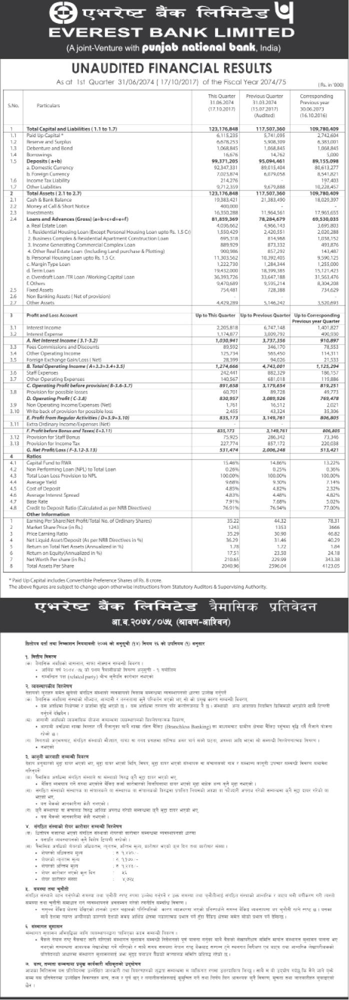 काठमाडौं । चालु आर्थिक वर्षको पहिलो त्रैमाससम्ममा एभरेष्ट बैंकले ५३ करोड १४ लाख रुपैयाँ नाफा गरेको छ । गत आवको यसै अवधिमा बैंकले ५१ अर्व ३४ करोड नाफा गरेको थियो ।