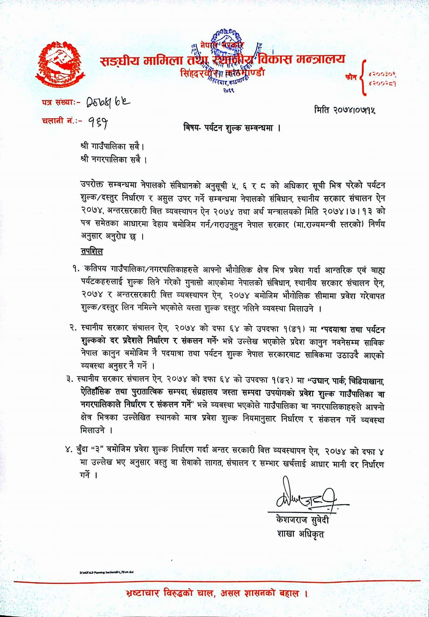 पत्रमा संबिधानको अनुसूची ५, ६ र ८ को अधिकार क्षेत्रभित्र परेको सीमा क्षेत्र प्रबेश शुल्क नलगाउन भनेको छ । पत्रमा, साबिकमा उठाउने गरेको पद यात्रा तथा पर्यटन शुल्क, नेपाल कानून र साबिक ब्यबस्था बमोजिम गर्न भनिएको छ ।