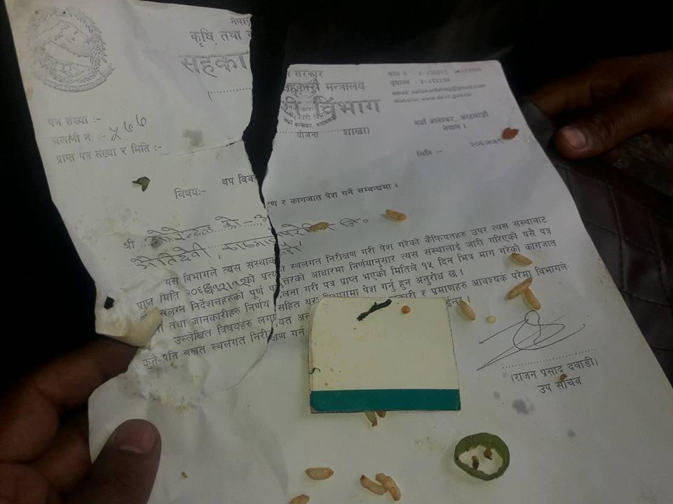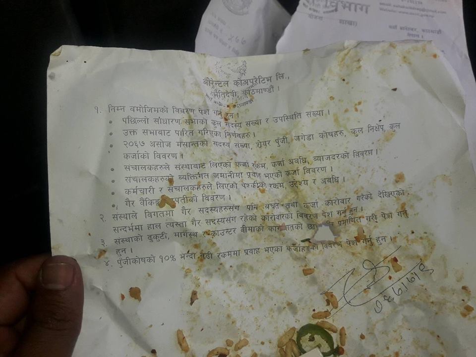 सहकारी विभागले ओरेन्टल सहकारीलाई काटेको पत्र अधिकारीले चनाचट्पटे खादा भेटेपछि सामाजिक सञ्जालमा सो फोटो भाइरल भएको छ । उपसचिव राजन प्रसाद दवाडीले २०६७ कात्तिक १९ गते ओरेन्टल सहकारीलाई तोकिएको विवरण पेश गर्नका लागि १५ दिने पत्र काटेको थियो ।