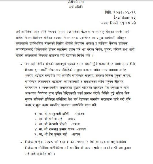 अर्थसमितिले साउन २९ गतेको बैठकले साँसद रामकुमारी झाँक्रीको संयोजकत्वमा पाँच सदस्यीय अध्ययन उपसमिति गठन गरेको थियो। समितिका सदस्यहरुमा प्रमिला राई, मेटमणि चौधरी, रामबाबुकुमार यादव र हेमकुमार राई छन् । अध्ययनका लागि उपसमितिलाई दुई महिनाको समयमावधि दिईएको छ ।
