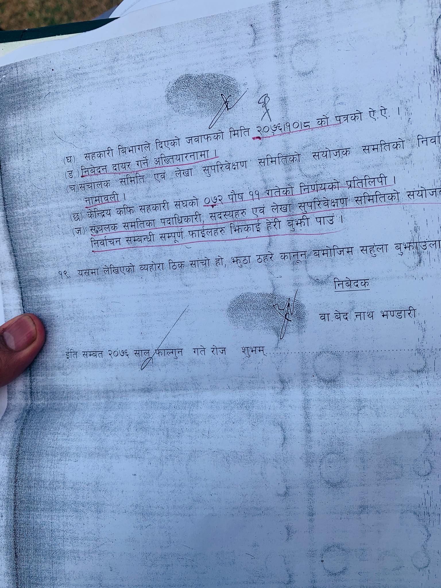 उनी २०७२ सालमा सम्पन्न संघको सञ्चालकमा चयन नै नभए पनि कफि केन्द्रीय संघको २०७२ सालको साधारणसभाको निर्णय पुस्तिकामा १२ जनाको मात्रै उपस्थिति रहेकोमा १३ औं नम्बरमा आफ्नो नाम थप गरी त्यसलाई फोटोकपी गराएर वकिलमार्फत प्रमाणित गराई पेश गरिएको उजुरीमा दावी गरिएको छ ।