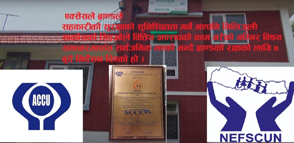 काठमाडौं । सहकारीको गुणस्तर प्रमाणीकरण कार्यक्रम ‘एक्सेस ब्राण्ड’ वितरणमा आर्थिक चलखेल भएको विषय सार्वजनिक भएसँगै एसियाली ऋण महासंघ (अक्कु) ले दोलाखास्थित मिलिजुली कालिञ्चोक सहकारी संस्थाको सिइओलाई निलम्बन गरी छानविन गर्न नेपाल बचत तथा ऋण केन्द्रीय सहकारी संघ (नेफ्स्कून) लाई निर्देशन दिएको छ ।