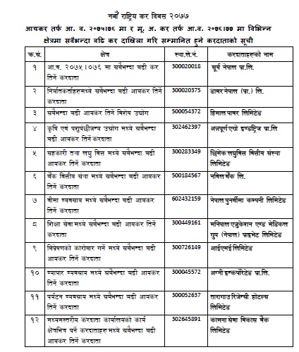 विभागबाट सम्मानित हुने उत्कृष्ट करदाता निम्न छन्: