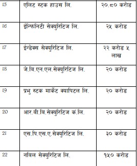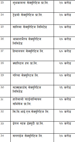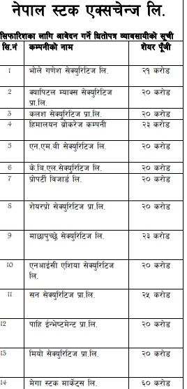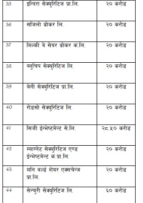 त्यस्तै आवेदन परेका मध्ये ६० करोड चुक्तापुँजी सहितको ब्रोकर कम्पनीको लागि मेगा स्टक मार्केट (मेगा बैंकको सहायक कम्पनी) सेन्चुरी बैंक र हिमालयन ब्रोकरेज (हिमालयन बैंकको सहायक कम्पनी) ले आवेदन दिएका छन् । आवेदन दिने कम्पनीहरु अधिकांश बाणिज्य बैंकका सहायक कम्पनीको रुपमा रहेका छन् । ति कम्पनीहरु निम्मानुसार छन् ।